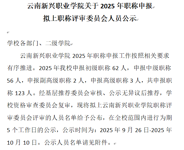 云南新兴职业学院关于2025年职称申报拟上职称评审...