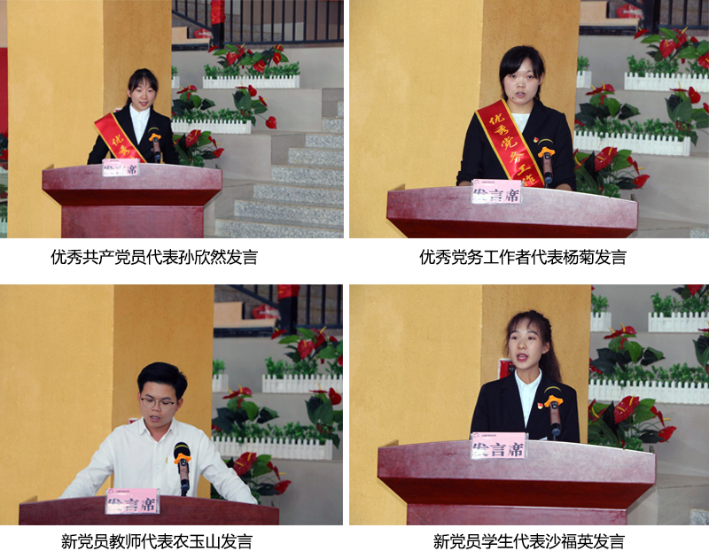 学校党委委员、副校长李地新同志宣读《关于表彰学校优秀共产党员、优秀党务工作者和先进基层党组织的决定》。表彰了孙欣然等30名优秀共产党员,杨菊等5名优秀党务工作者,护理学院第一党支部等4个先进基层党组织。2名先进个人和2名新党员代表在会上发言,向党组织表达他们的初心、信心和决心,郑重承诺将用实际行动来践行自己的誓言,完成肩负的职责和使命,铿锵有力的话语展现了新时代共产党员的责任与担当,也许下了对党忠诚、永不叛党的坚定承诺。