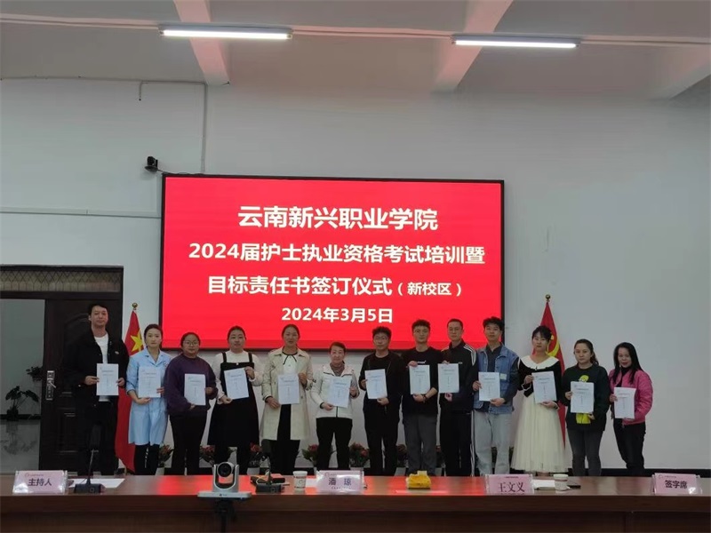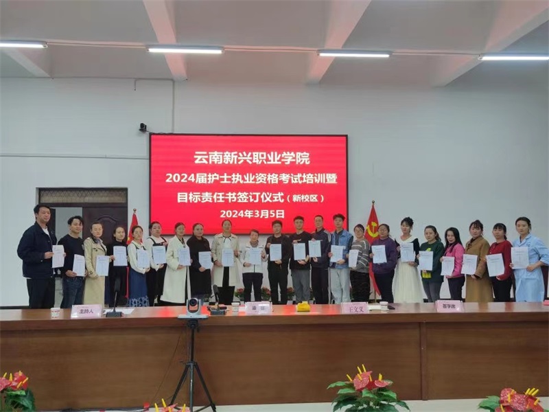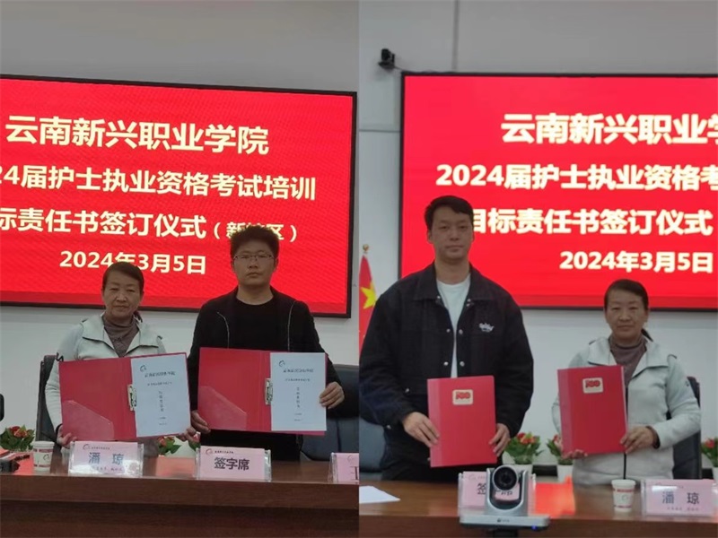 《护士执业资格考试》(以下简称“护考”)是国家级资格考试,通过“护考”是护理专业毕业生进入护理行业必备的“通行证”,而“护考”过关率则是衡量学校护理专业办学水平的重要指标。目前,云南新兴职业学院2024年“护考”培训已拉开序幕,为帮助学校护理专业学生积极备考,提升“护考”过关率,促进教学管理工作提升,2024年3月5日,云南新兴职业学院在新校区仁德楼402会议室举行护士执业资格考试培训暨目标责任书签订仪式。参加签订仪式的领导有云南新兴职业学院党委委员、副校长潘琼教授,护理学院党总支书记、院长王文义同志以及全体护培教师,签订仪式由护理学院副书记冯加能主持。