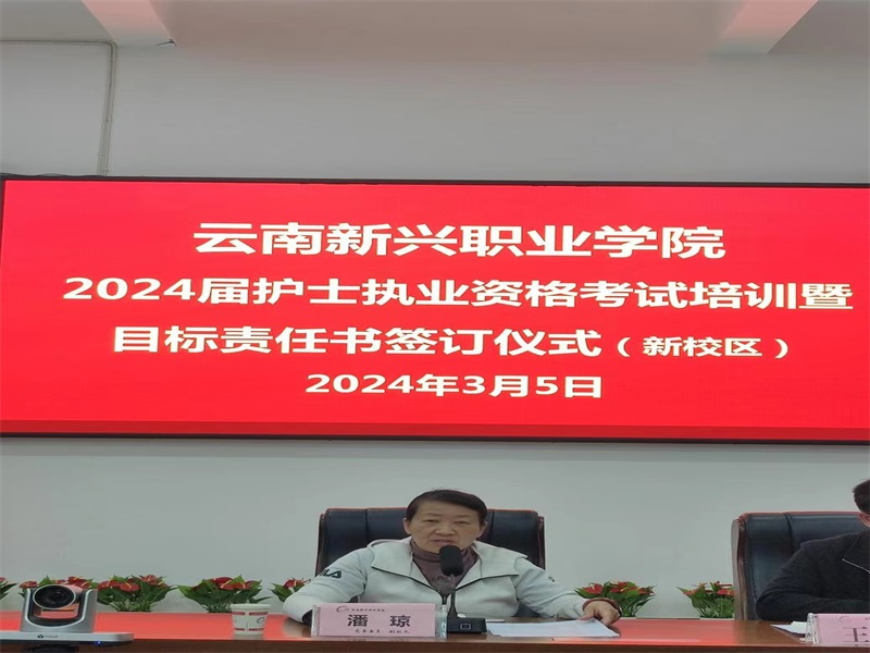 最后,云南新兴职业学院党委委员、副校长潘琼教授作总结发言。她强调,“护考”过关率是评价护理专业的重要指标,也是护理人才队伍建设的基础,不仅影响到护理专业学生的就业前景,更影响到家庭和社会的和谐稳定。本次签订目标责任书是对“护考”培训工作的一次全面动员和部署,所有护培教师要高度重视此次“护考”培训工作,护培辅导员要加强班级的有效监督和管理,严抓班级学风,学风正,教风才顺,考风才会正;任课教师要研究考纲,吃透考纲,把握考试方向,分析考题特点,增强教学的针对性,时刻关注新题型的变化,在教学过程中多总结,认真分析学生每一次考试成绩,紧盯薄弱环节,不断提高学生的成绩;管理人员要加强监督管理和巡查力度,严肃考风考纪,发现问题及时纠偏,统筹全局,统一思想,统一行动,集思广益,把成绩抓上去。