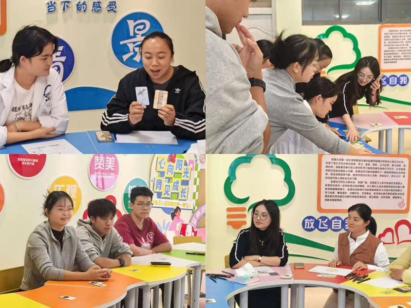 在轻松的氛围铺垫下,旅程转向内在深处。在安静的氛围中,进入了“压力面具”环节。老师们从基础卡中抽取代表近期压力感受的卡片,并用彩笔将这种无形的感受在画纸上具象化。没有评判,只有真诚的表达。当抽象的线条、色彩和符号在笔尖流淌,压力被“看见”和“命名”,完成了一次温柔的释放。