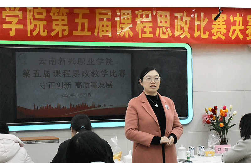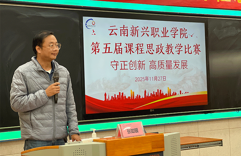 决赛开幕式上,教务处处长张如银在致辞中指出,竞赛以“守正创新,高质量发展”为主题,目前正值全国落实《教育强国建设规划纲要》、推进职业教育高质量发展关键期,课程思政是落实立德树人根本任务的关键举措,需将知识传授、能力培养与价值引领深度融合,把思政工作贯穿教育教学全过程。最后预祝云南新兴职业学院第五届课程思政教学比赛决赛圆满成功。
