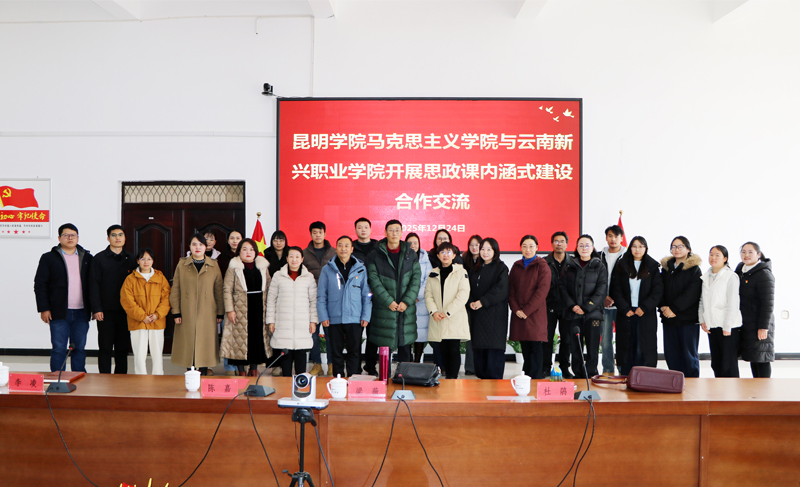 昆明学院马克思主义学院院长陈嘉、副院长梁薇、李凌、思想政治教育系主任杜鹃、办公室主任阮力江,云南新兴职业学院党委书记、督导专员马武宏,校长潘琼、副校长杨亚梅、党委办公室主任李云华、宣传部部长杨正光、教务处副处长姚林冬、马克思主义学院支部书记、院长晏涛及部分教师代表共同参会。