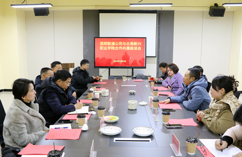 12月24日上午,云南新兴职业学院与中国联通昆明市分公司举行合作共建交流会议。双方就深化产教融合、共育社区数智化应用型人才达成多项共识,并计划携手打造集实习实训、创新创业、就业服务于一体的综合性社区人才培育基地。西山区船房社区党委书记李坤、中国联通昆明市公司副总经理陈兴祥、中国联通昆明市公司部门经理李静红、昆明市非凡信息科技有限公司董事长王伟、昆明市非凡信息科技有限公司项目经理郑云飞、微信电商“省心说”云南运营中心经理赵佳;云南新兴职业学院党委书记、督导专员马武宏,党委副书记李晓艳,党委委员、常务副校长李地新,党委委员、副校长杨亚梅,副校长李艳梅及相关职能部门负责人参加共建交流会议。会议由党委副书记李晓艳主持。