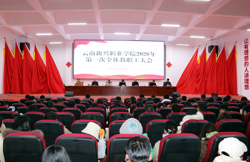 2026年1月12日晚,云南新兴职业学院2026年第一次全体教职工大会在学校报告厅顺利召开。会议由常务副校长李地新主持,全体教职工参加。