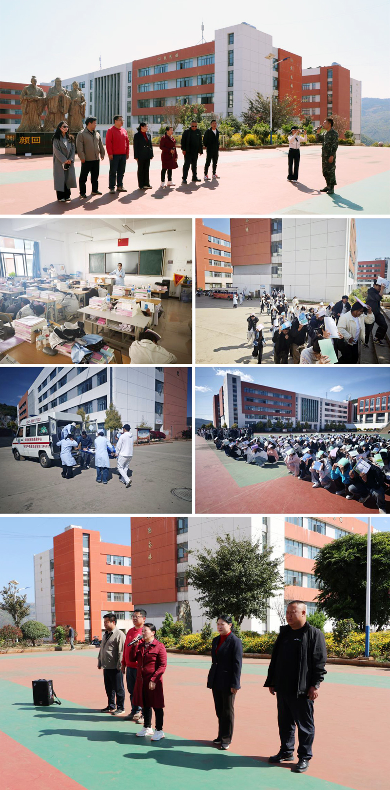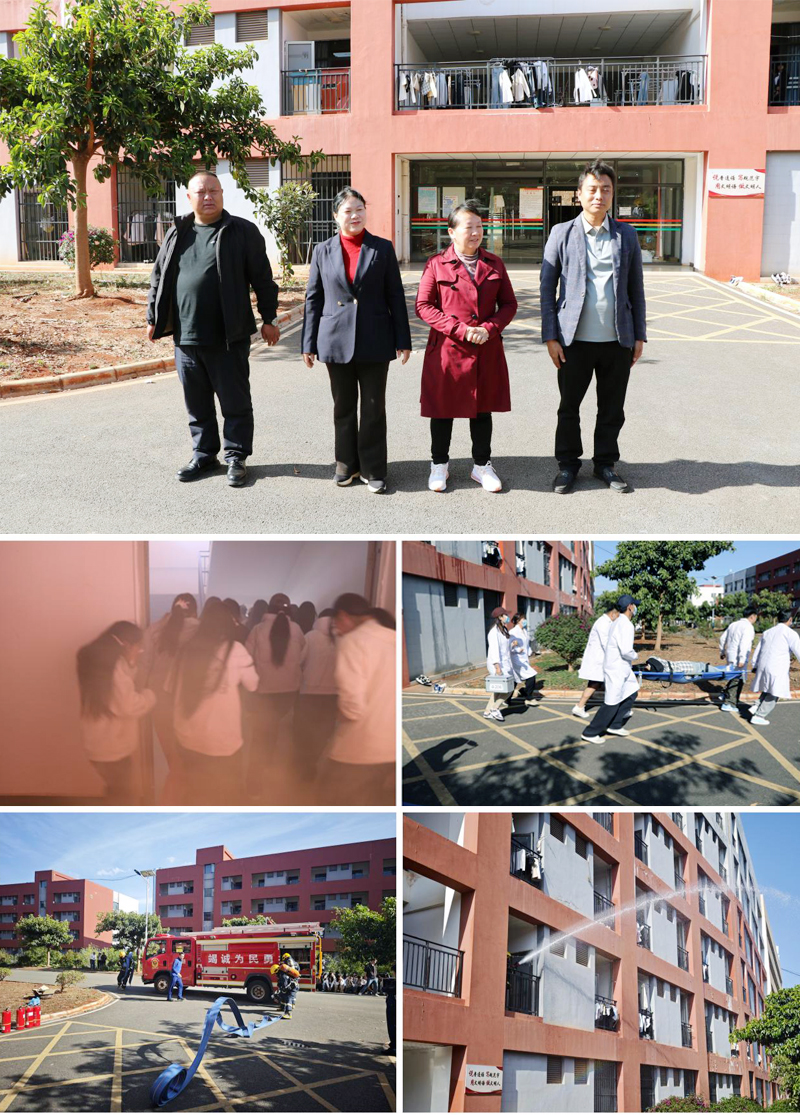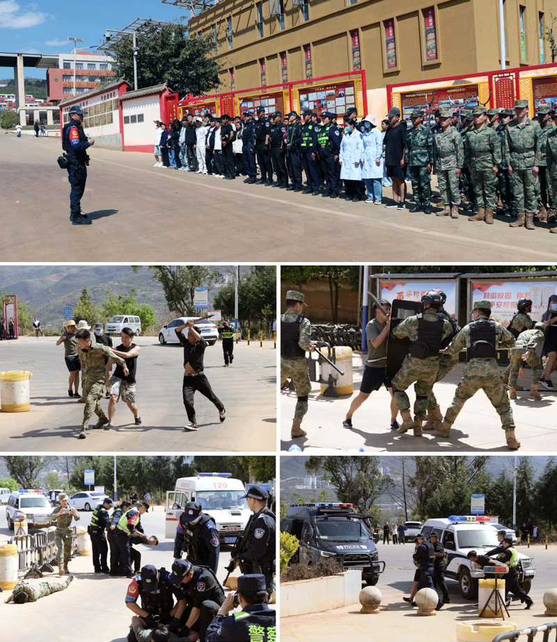 为深入贯彻落实全省2026年春季学期开学暨学校安全工作会议精神,切实提升师生安全防范意识和应急处置自救互救能力,学校于2026年3月20日联动禄劝县公安局反恐大队、特巡大队、崇德派出所,禄劝县消防救援大队,禄劝县中西医结合医院开展2026年春季学期校园安全综合应急演练。学校党委书记、督导专员马武宏,党委委员、校长潘琼,党委委员、常务副校长李地新,副董事长王会琼及部分中层干部组成观摩团现场指导,统筹调度演练工作。