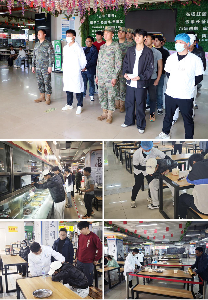 场景四:教育与管理学院、计算机与人工智能学院联合开展学生食堂疑似食物中毒应急演练。模拟学生就餐后出现身体不适的突发情况。学校立即启动食品安全突发事件应急预案,相关工作人员快速行动、分工协作,高效完成可疑食品封存留样、不适学生初步诊疗登记、紧急送医救治以及食堂涉事区域全面消杀等一系列处置工作,全流程筑牢师生饮食安全防线。