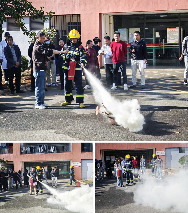 演练结束,禄劝消防大队消防员开展消防逃生知识培训。结合全国高校校园火灾案例,讲解日常排查隐患方法,演示火场逃生动作要点与自救技巧,纠正师生错误逃生观念,让师生直观认知宿舍火灾风险。随后,消防员演示干粉灭火器“提、拔、握、压”操作步骤,强调站位、喷射角度等注意事项,邀请师生实操,纠正握姿、喷射位置等问题,使师生掌握正确使用方法,将安全知识转化为实操能力。