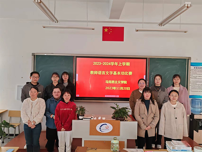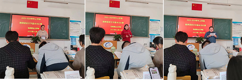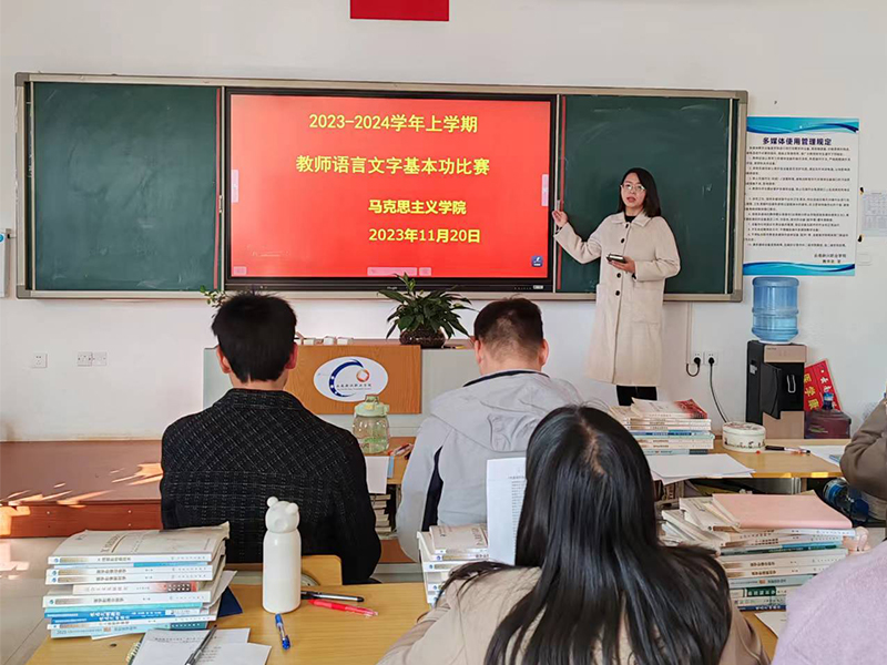 根据云南新兴职业学院《关于组织2023—2024学年上学期教师语言文字基本功比赛的通知》要求,为引导教师增强语言文字规范意识,切实提升教师语言文字应用能力,云南新兴职业学院马克思主义学院于2023年11月20日在博学楼301开展2023—2024学年上学期教师语言文字基本功比赛。马克思主义学院副院长李晓慧、副院长晏涛、形势政策与实践教学教研室主任张洪、马克思主义学院教师周鑫、马克思主义学院教师肖静出席本次比赛并担任评委。