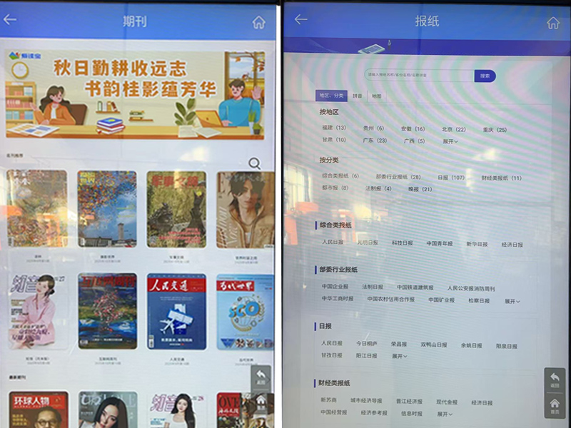 (2)电子期刊师生通过访问图书馆蓝悦智慧屏数据库(附件2-蓝悦APP客户端使用手册202406)查阅目录,目录清晰地列出了报刊杂志的名称、馆藏位置及更新频率,助您快速定位心仪读物。