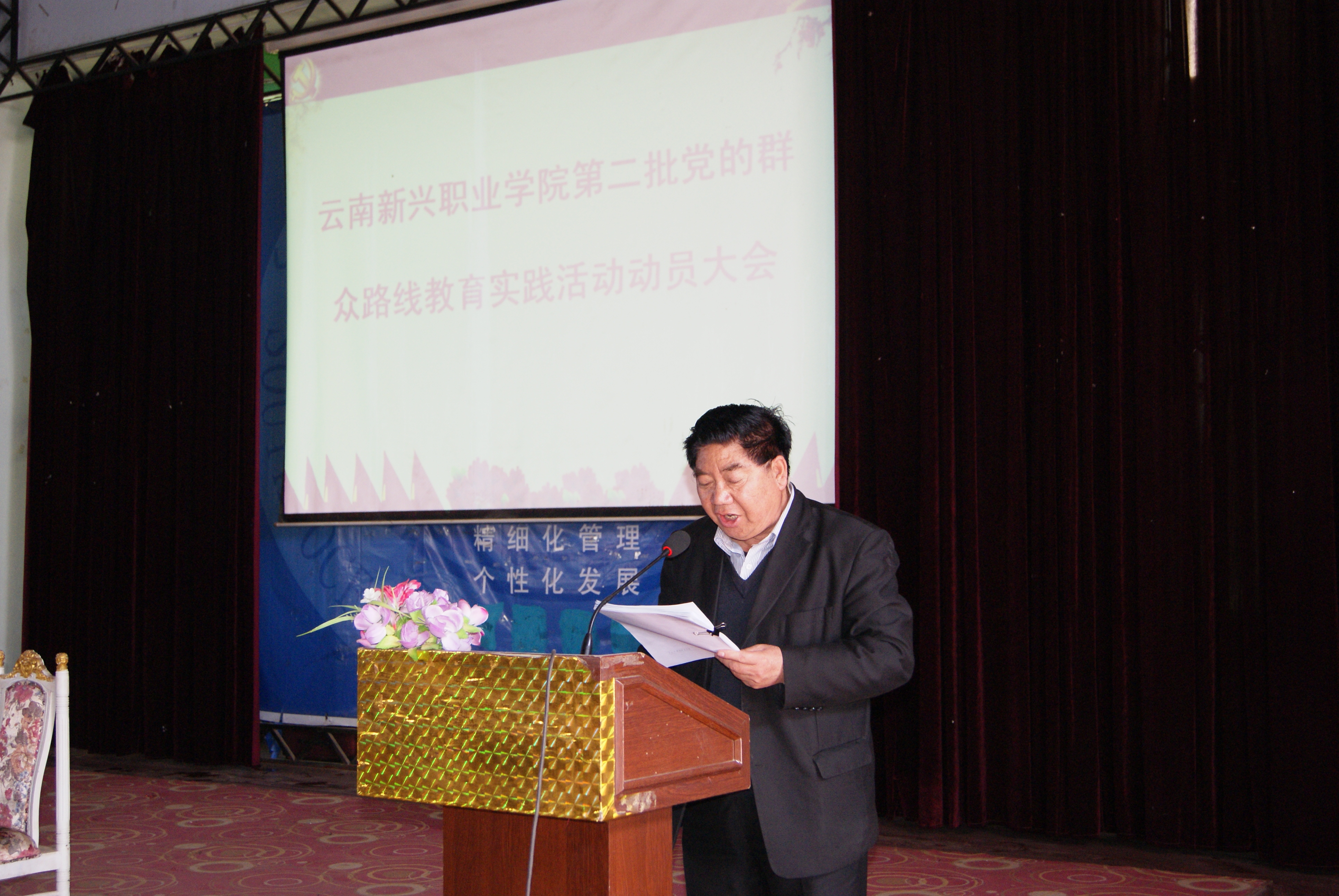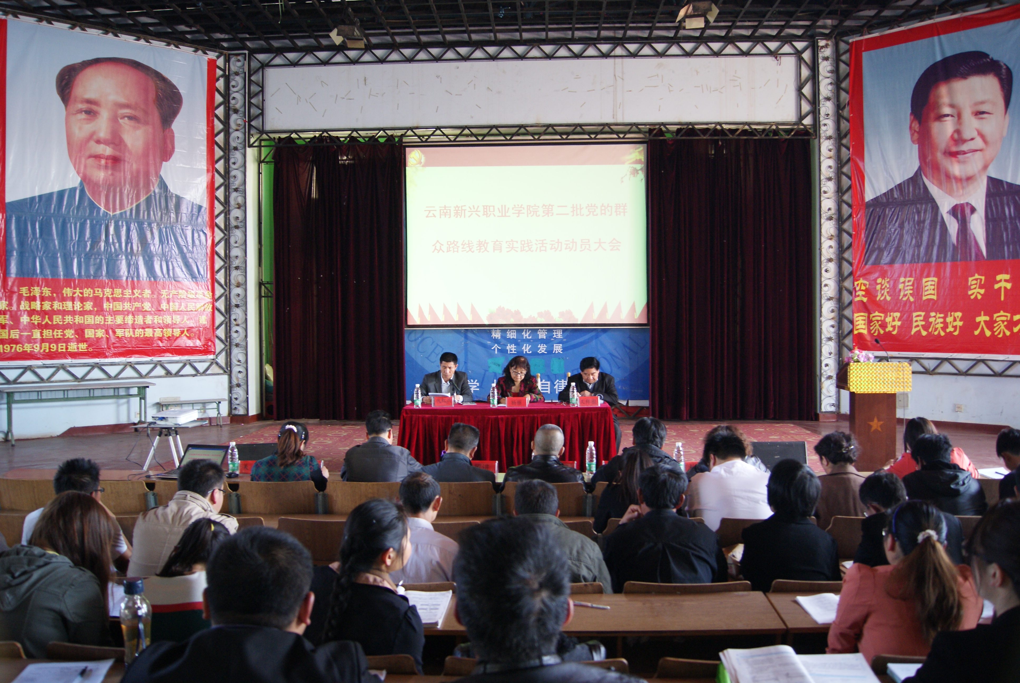 教育实践活动的实施意见》(云办发〔2014〕4号)、中共云南省委党的群众路线教育实践活动领导小组《关于在全省第二批党的群众路线教育实践活动中加强基层党组织分类指导的意见》(云教群组〔2014〕1号)文件的有关精神和督导组有关通知要求,2014年3月4日下午3点,云南新兴职业学院全体党员及师生代表在多功能厅召开了以“为民、务实、清廉”为主题的第二批党的群众路线教育实践活动动员大会,省委高校工委、省教育厅督导组副组长(原省教育厅副巡视员、云南城市建设职业学院党委书记)杨丽同志、民办教育处副处长王骏同志、昆明学院社会管理学院党总支副书记罗进同志、昆明理工大学机电工程学院正科级组织员和春华同志出席了此次大会。大会由学院党委副书记、学院院长关祥祖同志主持,会议共三个议程,一是学院党委书记代红兵同志作动员讲话;二是督导组副组长杨丽同志讲话;三是对院级党委班子和院级党员领导干部进行作风建设情况民主测评。
