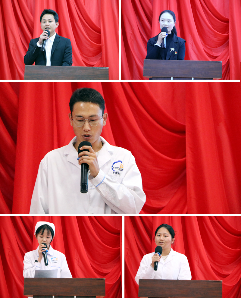 任课教师代表张恒彪老师、辅导员代表贺敏老师发言,郑重承诺将深耕考点、精准辅导,全程跟进备考进度,及时答疑解惑,以专业的教学和贴心的服务助力学子通关;往届学生代表李晓杰、张意妮与应届学生代表王心凌先后发言,分享备考经验、坚定备考信念,传递并肩前行的备考力量。