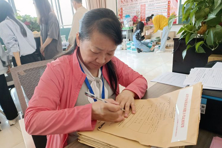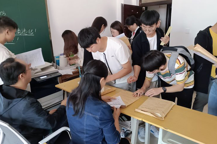 考试结束后,在仁德楼101教务处办公室,全体考务人员认真核对各考场试卷数量、试卷袋信息填写情况,核实无误后进行封袋,返卷签字完成本场考试的收尾工作。
