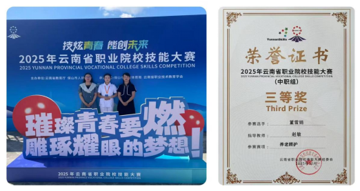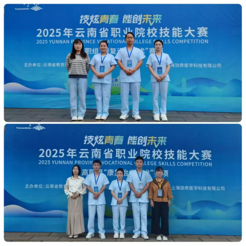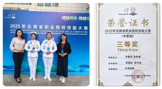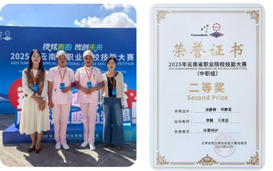 4项二等奖分布于高职组与中职组。在高职组赛场,陈彦臻、舒燃、肖盛团队(指导教师谢维俊、秦思凡)获“口腔医学技术”赛项二等奖,兰阳、王小棒、文超锦团队(指导教师杨董梅、赵克凡)、念子娥、曹彧江、穆芸锐团队(指导教师李洪艳)双双获“康复治疗技术”赛项二等奖,周婷婷同学(指导教师李明姣)获“老年护理与保健”个人赛二等奖;在保山市承办的中职组赛场,周静榕、邓静柔团队(指导教师普敏、王荣念)凭借规范的操作获“母婴照护”赛项二等奖,充分展现了我校在不同办学层次、不同专业领域的技能培养实力。
