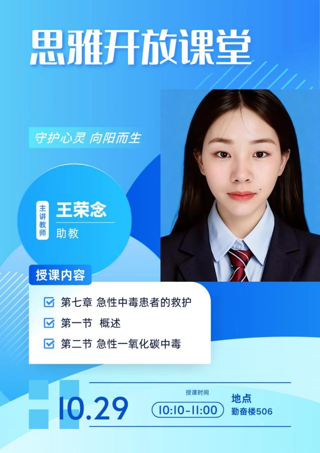 为强化护理专业学生的急救素养,助力其掌握急性中毒救护的关键知识与技能,2025年10月29日10:10-11:00,思雅开放课堂于勤奋楼506教室开展“急性中毒患者的救护”专题教学活动。本次课程由王荣念老师主讲,以“守护心灵 向阳而生”为导向,聚焦急性中毒领域的核心知识点,为护理学子呈上了一场兼具专业性与实用性的知识盛宴。