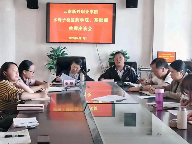2023年4月12日下午在行政楼二楼会议室召开药学院、基础部教师座谈会。学校党委委员、副校长潘琼教授,水海子校区管委会武正文主任、教务处李艳强副处长,与药学院15位教师、4位辅导员和基础部15位教师面对面座谈交流。