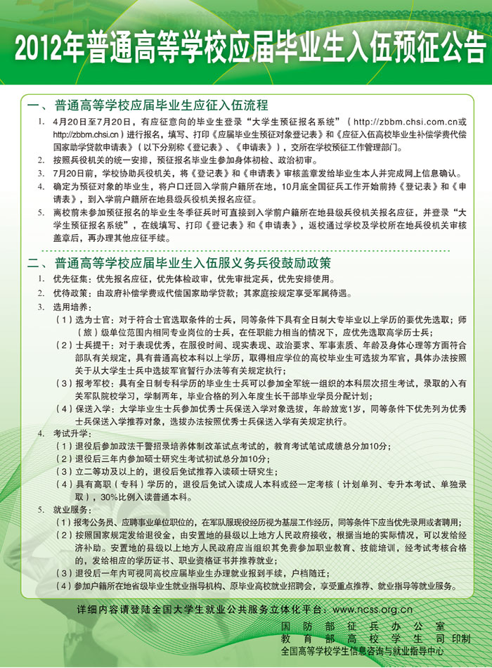 2012年普通高等学校应届毕业生入伍预征公告