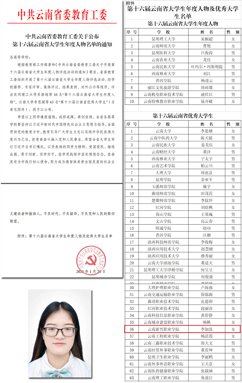 【喜报】云南新兴职业学院李加连荣获“云南省第十六届优秀大学生”荣誉称号