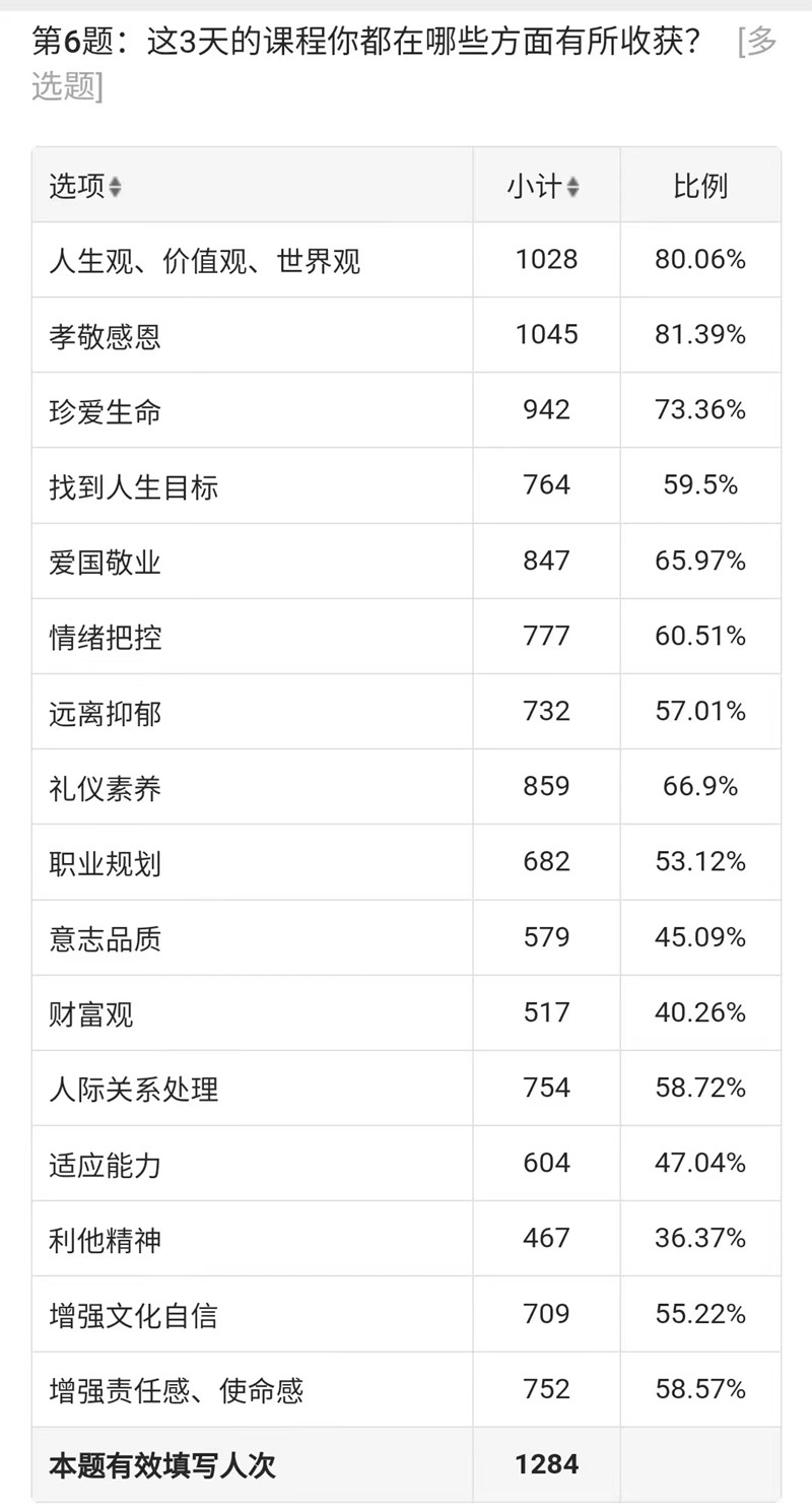 此次课程内容包括《为什么学习传统文化》《四届道德讲堂综述》《幸福掌握在自己手中》《百善孝为先》《爱的觉醒》等,同学们在学习过程中都能做到认真学习,积极与主讲老师互动,在互动学习中也收获许多,世界观、人生观、价值观有很大的提升和改进,学到了做人的根本孝道,精神面貌也更加地焕然一新。