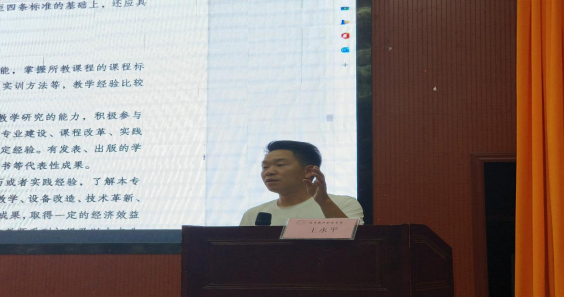 其次,教务处王永平副处长对评选“双师型”的认定范围、要求、标准及评选的条件进行解读。评选双师型人才应同时具备学术水平和教学水平,能够开展课程建设和教学改革工作,对学生进行思想引领和实践指导,有较强的组织与协调能力,能够对重要的课题进行研究,形成一定的研究成果,并在教学实践中得到了有效的应用。