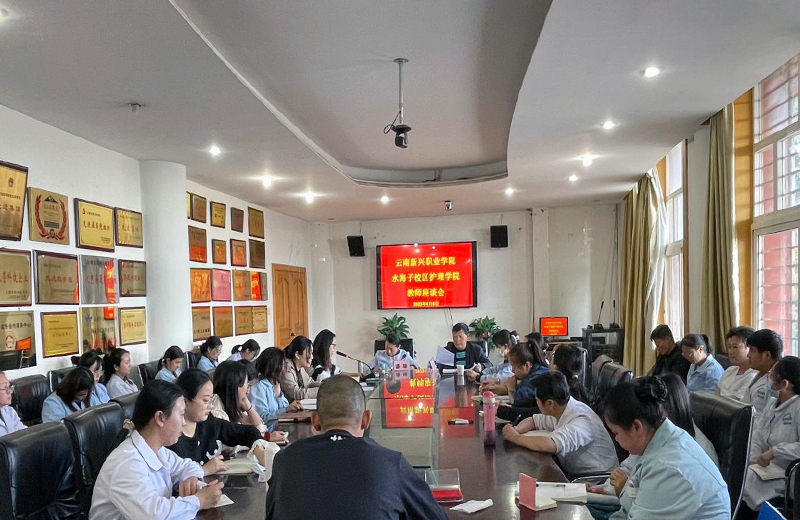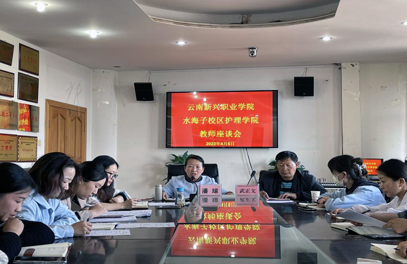 云南新兴职业学院(水海子校区)护理学院座谈会于2023年4月5日下午在行政楼会议室举行,学校党委委员、潘琼副校长,水海子校区管委会武正文主任与护理学院29位教师、12位辅导员面对面座谈交流。