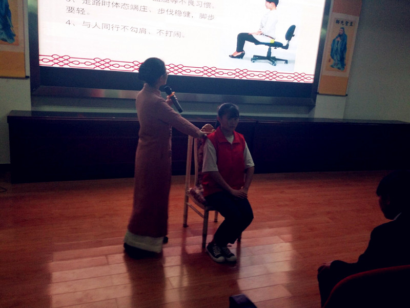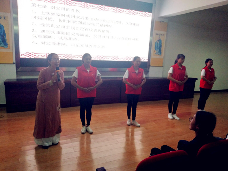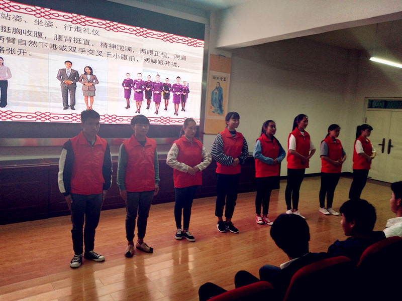 起学生的兴趣,导入礼仪背景知识的介绍,使学生认识学习礼仪的重要性。然后她从集会礼仪、仪表礼仪、尊师礼仪、同学礼仪、宿舍礼仪、用餐礼仪等13个方面边讲解边示范给学生们上了一堂生动的礼仪培训课。随后在16—17日下午又对学生们分批进行了文明礼仪站姿、坐姿、走姿、行礼等实操项目进行了培训。接下来首批参加培训的社团干部和各班代表将分批进班进行文明礼仪推广。愿礼仪之花开遍新兴校园,构建一个更加和谐文明的校园。