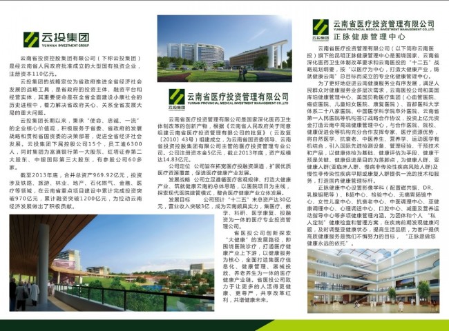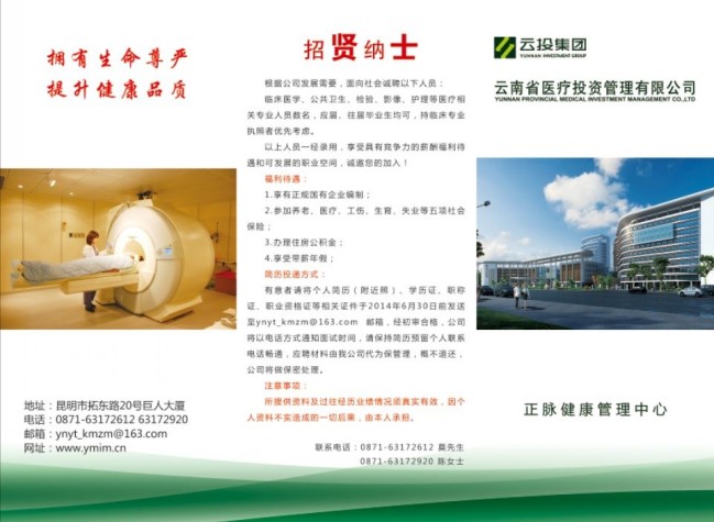 云南省医疗投资管理有限公司(以下简称云南医投)旗下昆明正脉健康管理中心(以下简称中心)是围绕云南医投的“十二五”战略目标,为了更好的服务于云南人民铸就健康云南、创建大健康产业而成立的专业化健康管理中心。公司以三甲医院(云南省第一人民医院新昆华医院、云南省阜外心血管医院等)建设和运营为主业,打造贯穿健康预防干预、疾病治疗、康复养生三大领域的健康产业链,充分整合医疗资源,为了满足人民多层次健康需求服务。