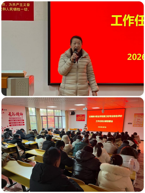 2026年1月7日上午,云南省教育厅召开2025年高等院校专业综合评价结果通报会暨高等院校专业建设推进会,云南新兴职业学院为了更好地落实会议精神,提升学院专业建设水平,于当日下午召开了第三轮专业综合评价工作任务分解会议。学校校长潘琼、各相关职能部门负责人、各二级教学部门负责人、各专业负责人、各专业实训中心负责人、专业综合评价工作专班组成员齐聚一堂,共同明确下一阶段专业综合评价工作的具体任务与分工。本次会议由科研与信息中心李彦升处长主持。