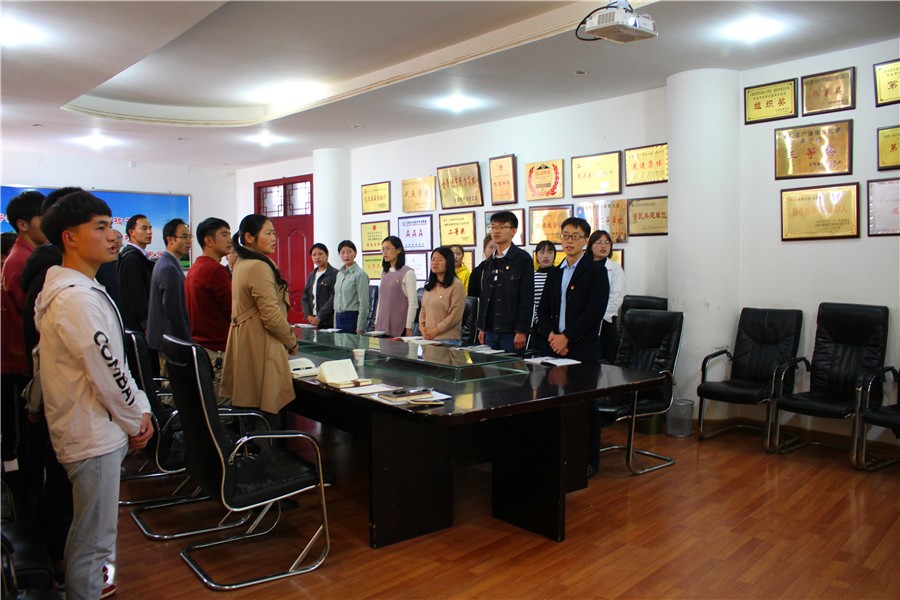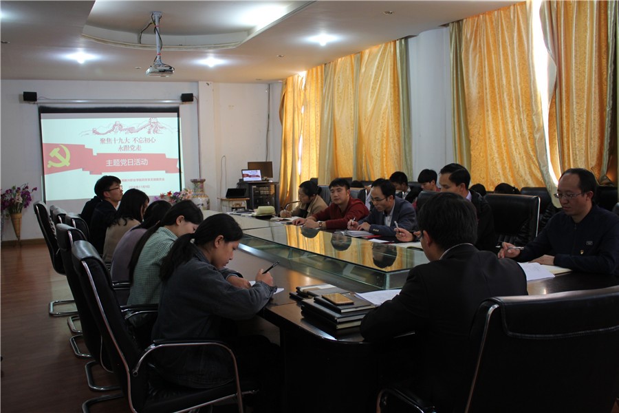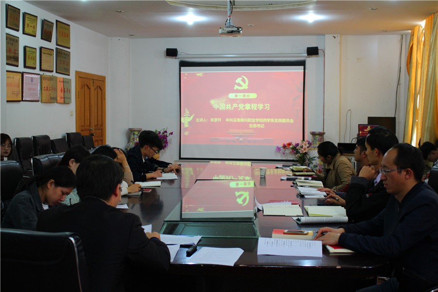 2018年11月9日,下午14:30,云南新兴职业学院药学系党支部在学校行政楼会议室如期举行“聚焦十九大,不忘初心,永跟党走”主题党日活动。活动由支部书记李彦升同志主持,支部教师党员、预备党员同志参加。