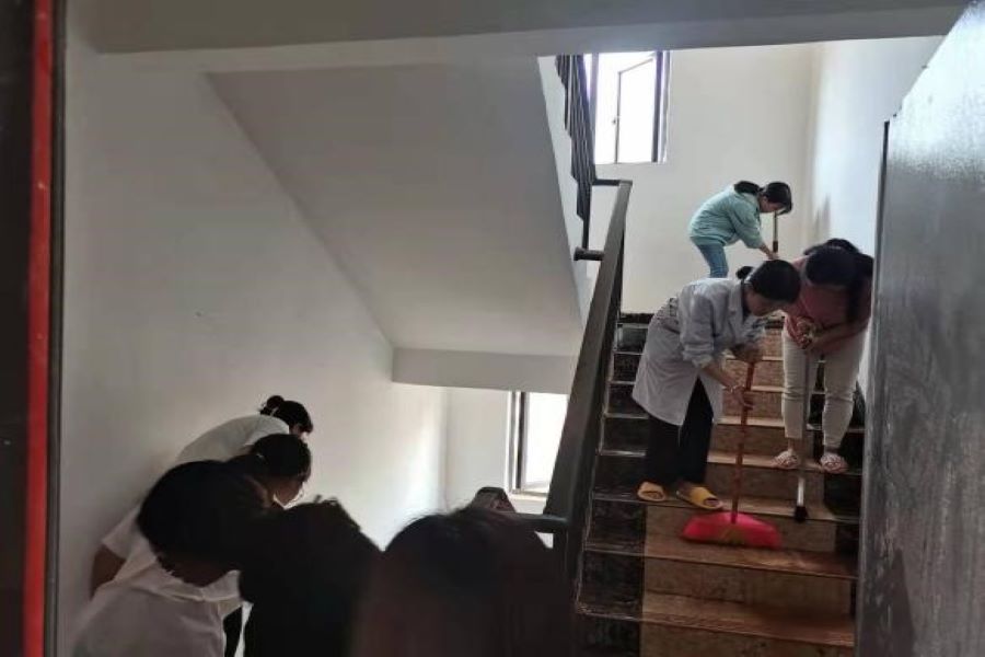 本次活动老师和同学们都积极的参与到其中,在劳动中充分的体现了大家不怕脏、不怕累的精神,展现了大学生积极向上、锐意进取的精神风貌。经过半天的辛勤劳动,33栋教师公寓的楼梯,走道干净整洁,环境卫生有效改善。
