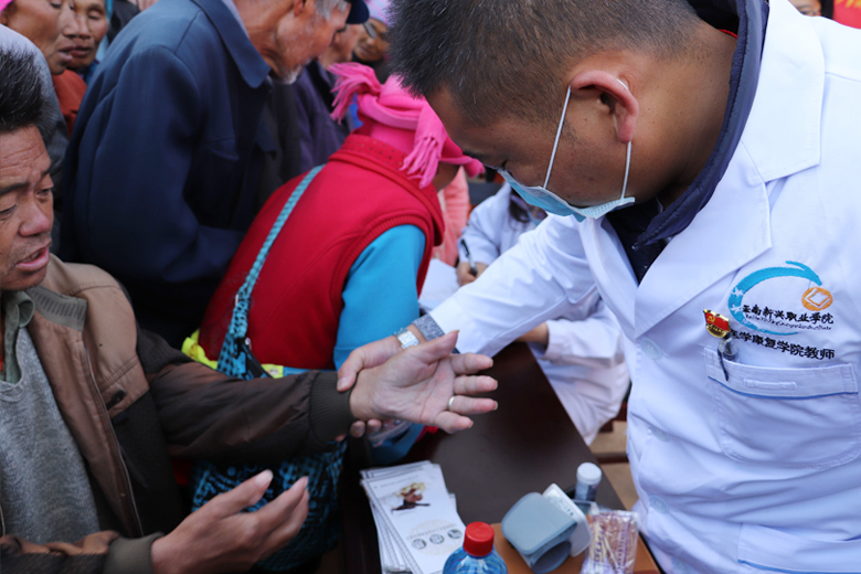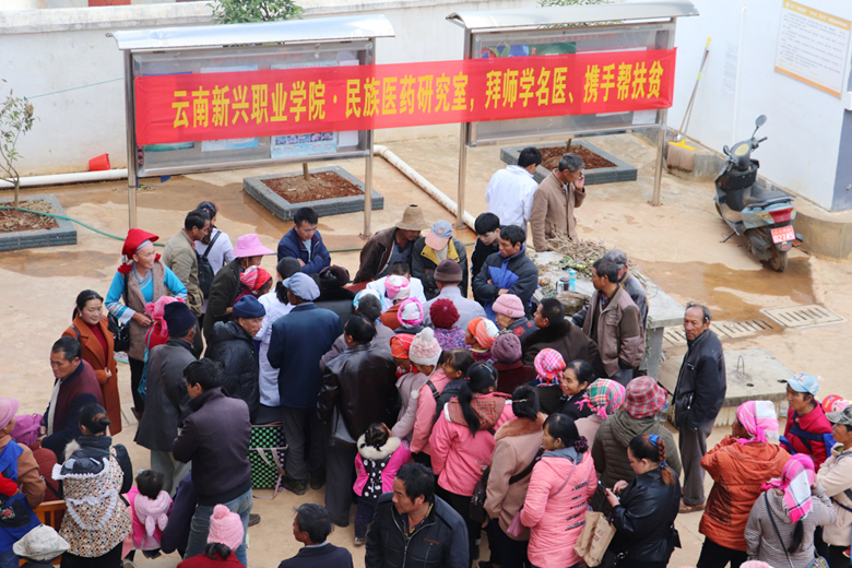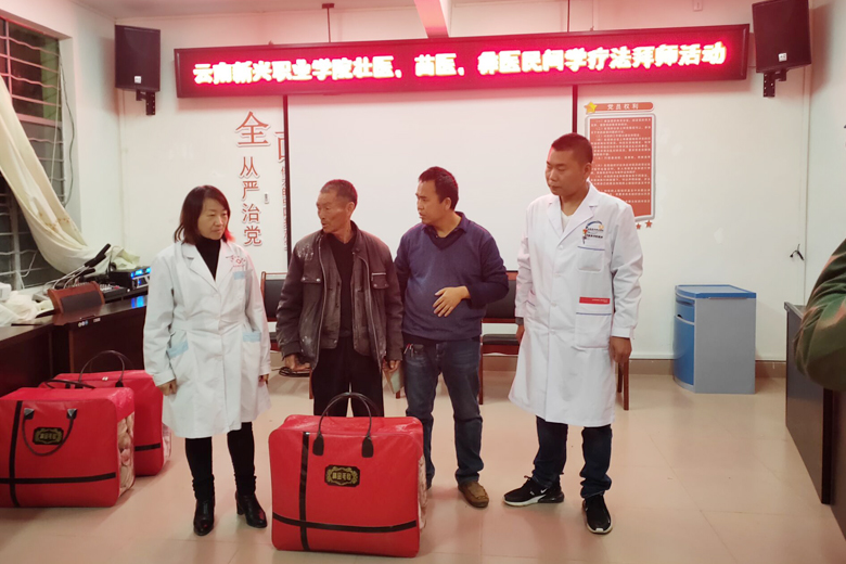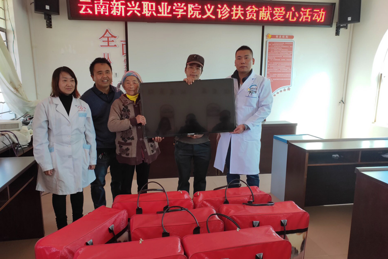 2018年12月22日,云南新兴职业学院医学康复学院民族医药研究室全体教师在学院潘琼副院长带领下,一行11位老师前往文山州丘北县新店乡卫生院,进行义诊活动,并对当地建档立卡户进行帮扶活动,对当地贫困户捐赠毛毯、电视机及衣物等物品。