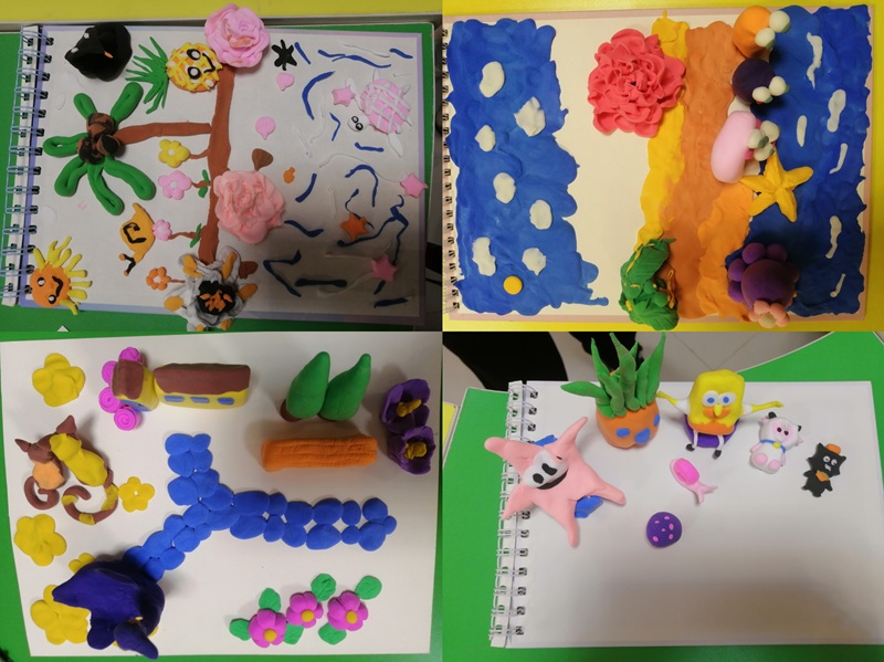 从“旧我”到“新我”,从“烦恼”到“希望”。学生们拿起彩泥,将之前积压的情绪通过揉、捏、搓、压等动作悄然释放。老师引导大家思考:彩泥可以不断重塑,内心也同样拥有改变的力量。学生们专注地将手中的泥块变为心中的意象——有人捏出蓝天白云,象征豁达;有人塑造海洋沙滩,寄托向往;椰风海岸、卡通萌宠、花草树木、可爱的小动物……一件件作品在指尖诞生,原本躁动的心也随着创作的深入渐渐沉静下来。